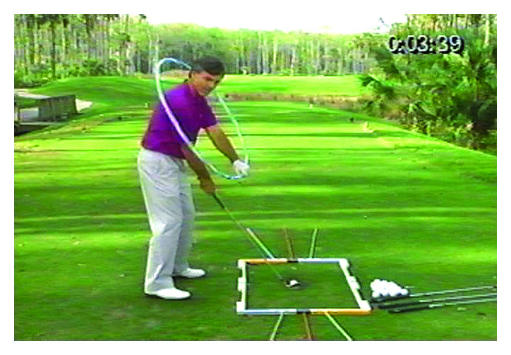 When I teach this principle, I again hold a hula-hoop around the student's body so that he or she can clearly see how the hands must work in a circle in order to let the club orbit the body. I encourage students to visualize their arms swinging around their spine and body like a helicopter — with their arms being the blades and the club head being the tip of the propeller. The focus is not on hitting the ball, but on seeing and feeling the proper circular swing motion. Then as we carry this same circular swinging motion to the tee, the ball simply gets in the way as the club swings through its circular orbit from start to finish, sending the ball straight and far.